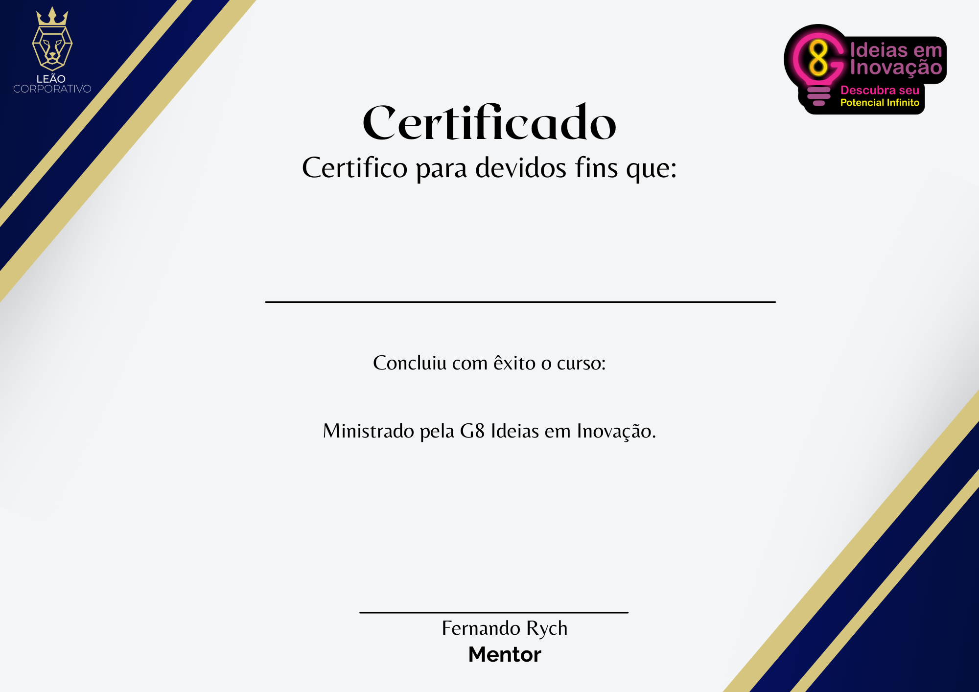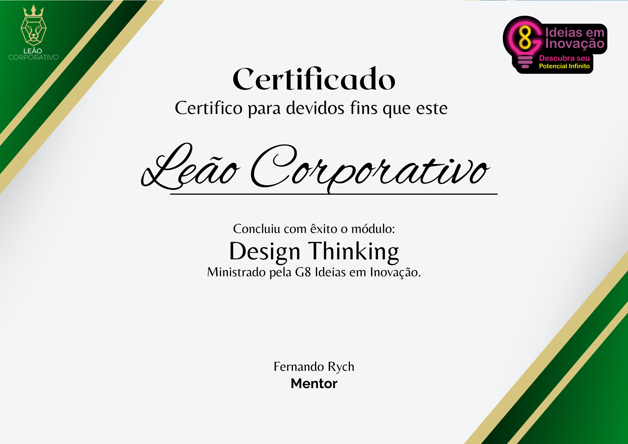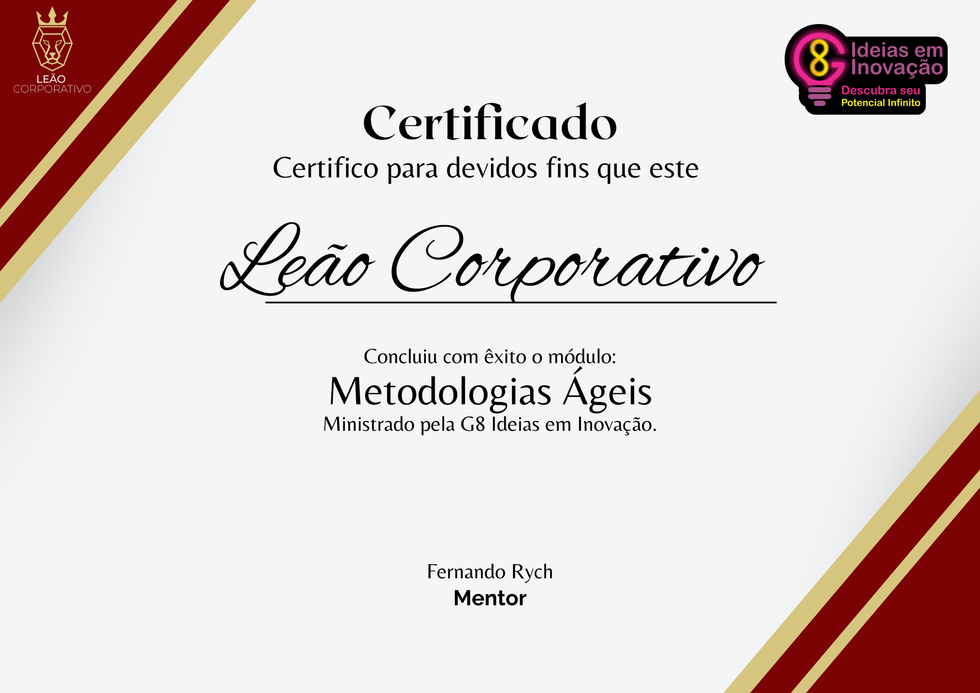 Além dos benefícios, você ainda terá acesso a uma mentoria mensal com um consultor especialista G8 Ideias em Inovação por 12 meses! Isso mesmo, você terá a oportunidade de por em prática, tirar dúvidas e direcionar sua carreira com um especialista de uma consultoria renomada.